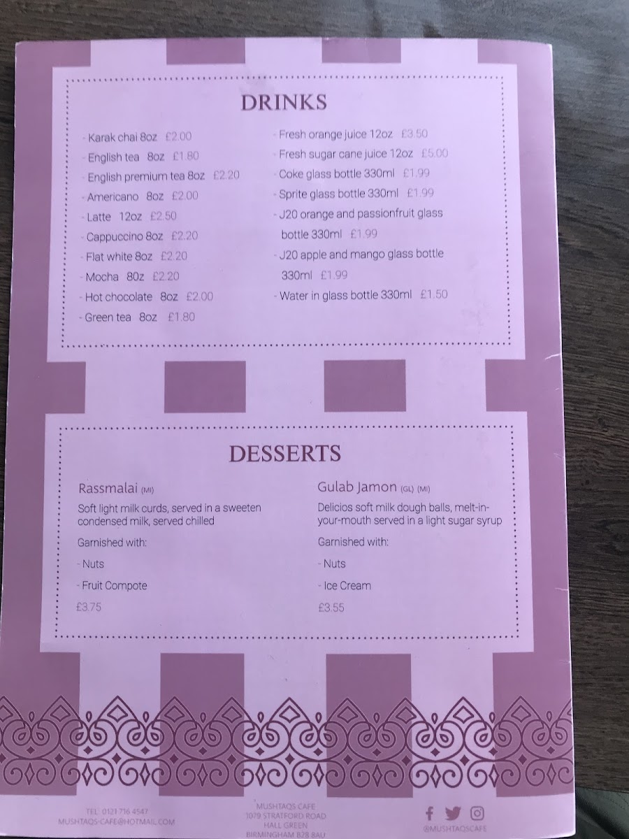 Welcome to Mushtaqs Cafe, a charming culinary destination located at 1079 Stratford Rd, Birmingham. Emphasizing a delightful mix of traditional Pakistani breakfast and quick snacks, this cafe has quickly gained a buzz among locals. The menu showcases a range of offerings from generously portioned breakfasts to enticing desserts. Diners rave about the premium Pakistani breakfast, beautifully presented and full of hearty flavors, though some note that portions could be more substantial for the price.